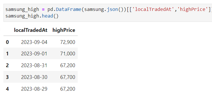 코드로 날짜와 일별 최고가만 따로 데이터 프레임으로 뽑아내